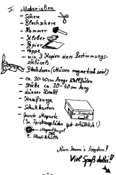 Die nötigen Bauteile für diese Schaltung bekommt ihr in einem Elektronikfachhandel, sie kosten etwa 4,- DM. Sagt beim Einkauf, was ihr mit diesen Bauteilen vorhabt, dann bekommt ihr die richtigen Dimensionierungen. Fragt auch - falls nötig - nach einem Merkblatt für richtiges Löten. Falls ihr keinen Lötkundigen in der Bekanntschaft habt und nicht sicher seid, ob die Lötstelle gut geworden ist, wird euch der Elektronikhändler sicher gern helfen.