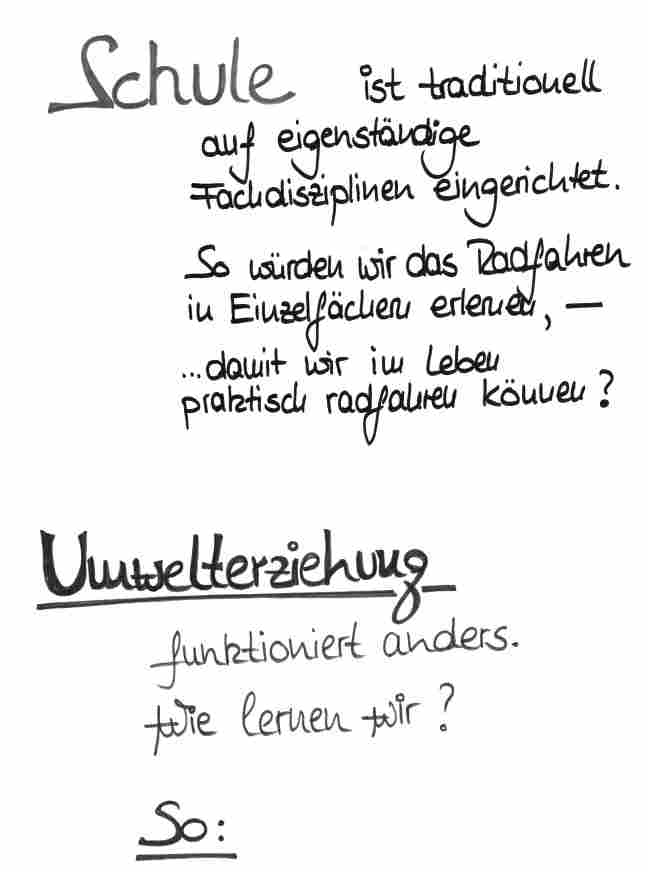 Die heute übliche Schule ist als Ort für die Umwelterziehung äusserst ungeeignet. Umwelterziehung könnte vielleicht einiges in der Schule reformieren, sie könnte also der Institution Schule helfen mit ihren starren Formalismen umzugehen.