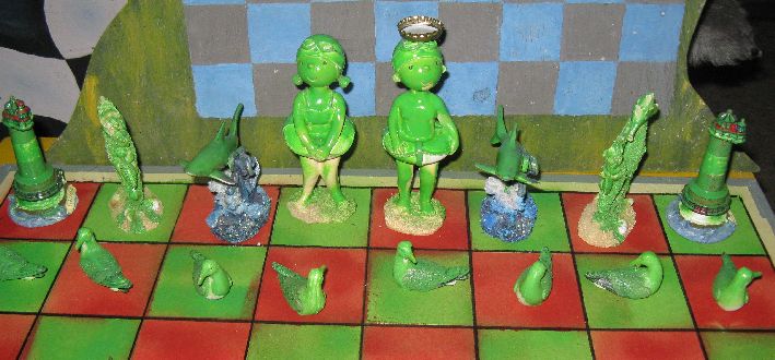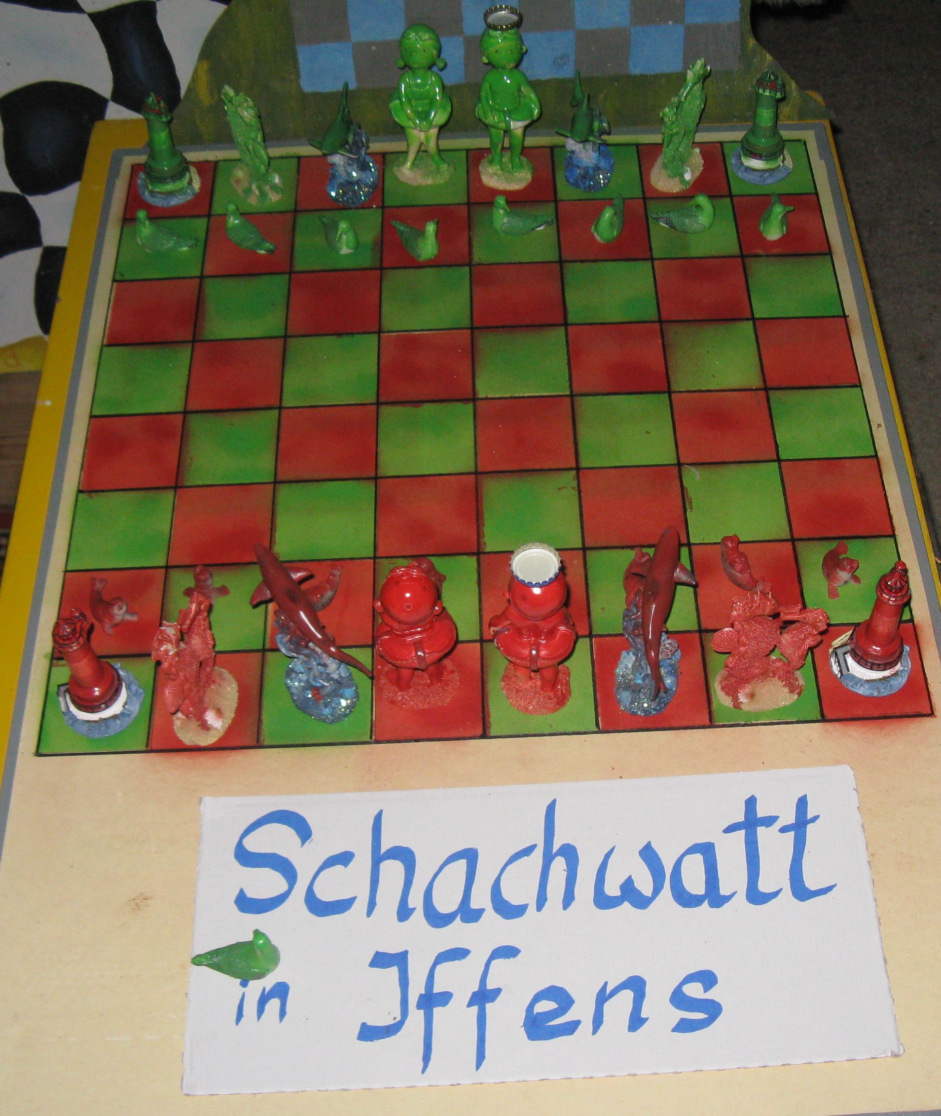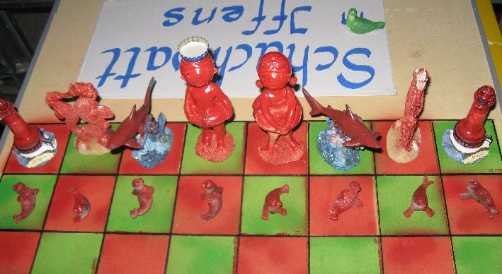 Der König wird Neptun, die Königin zur Meerjungfrau, die Läufer sind Seehunde, die Springer Seepferdchen und die Türme werden zu Leuchttürmen. Die Bauern werden von Muscheln gemacht und das Spielbrett hat helle Sandwatt- und dunkle Schlickwattfelder.