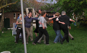 Abends war die Stimmung wieder lustig, mit einer Jonglage Vorführung von Luca, vielen gesungenen Liedern, Musik, Witzen und der Erfindung der feministisch-vegetarischen Sprache.