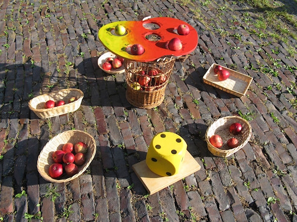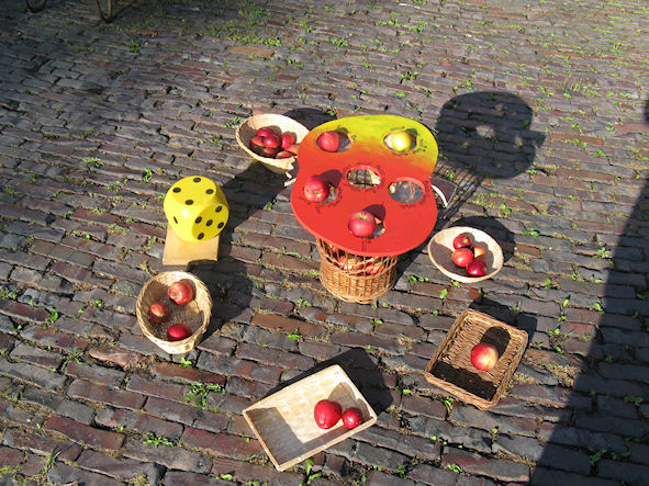Zwei SpielerInnen dürfen abwechselnd einen, zwei oder drei Äpfel wegnehmen.