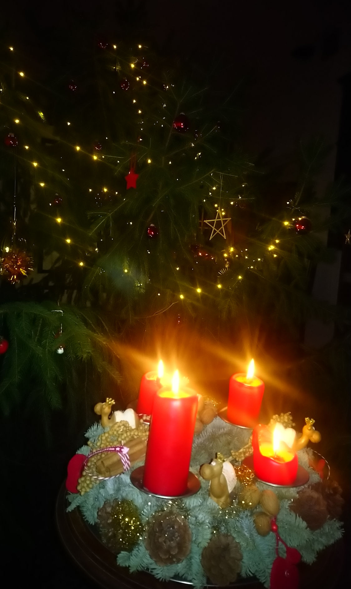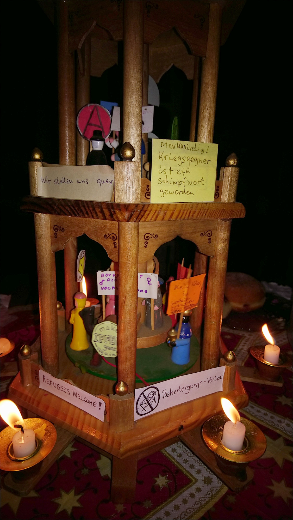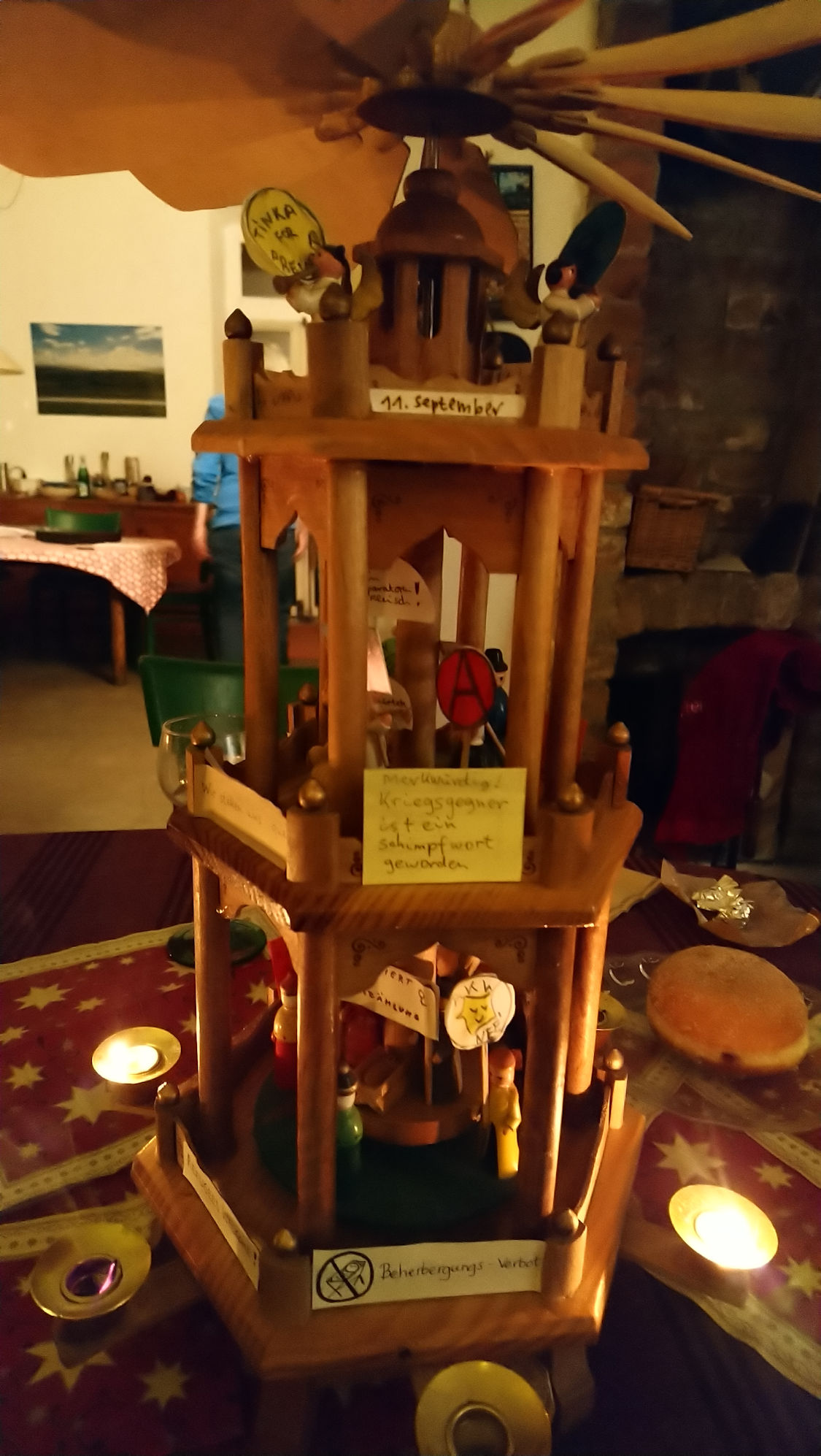 Unsere Weihnachtspyramide ist schon 40 Jahre alt. Jedes Jahr bekommt sie ein neues Motto.