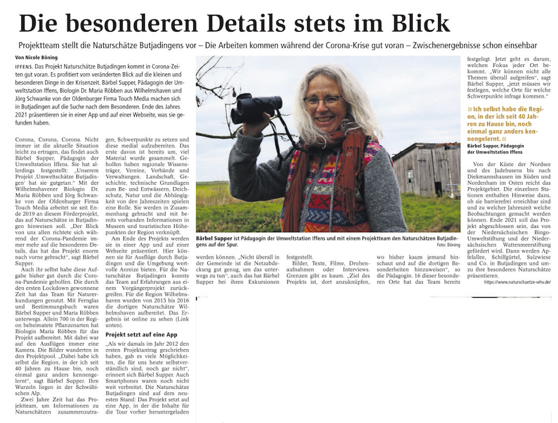 Diese Zeitungsartikel aus der Kreiszeitung beschreibt unser Projekt zu den Naturschätze in Butjadingen.