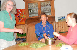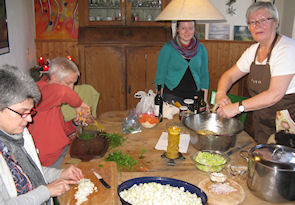 Fürs gemeinsame Essen schnibbeln alle unter Petras Aufsicht mit.