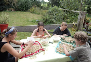 historische Getreideernte mit Petra, Tim, Jana und Amelie.