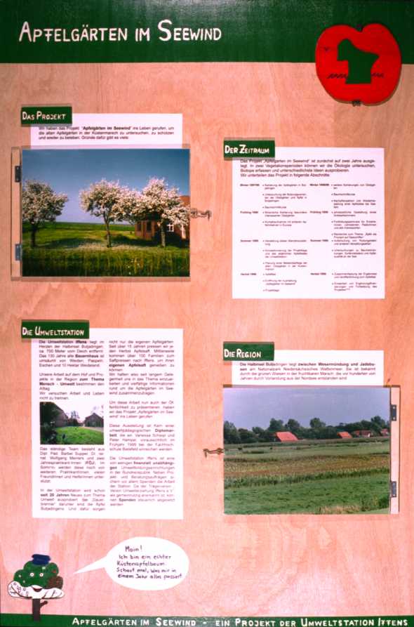 Mit der Pinnwand zeigen wir außerdem noch, daß das Projekt “Apfelgärten im Seewind” noch nicht abgeschlossen ist und die Betrachter noch die Möglichkeit haben, sich in der ein oder anderen Weise daran zu beteiligen. Auf jeden Fall wird zur weiteren Verfolgung des Projektverlaufs angeregt.