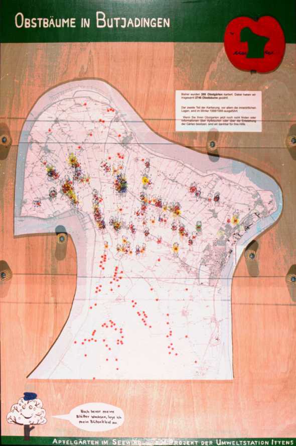 Eine große topographische Karte der Region Butjadingen ist auf Kork aufgezogen, damit sie etwas hervortritt. Auf der Karte ist jeder, der bisher kartierten Apfelgärten mit einem roten Klebepunkt markiert und in einem Teilbereich – hinter einer Plexiglasscheibe – haben wir für jeden Baum eine Stecknadel in die Gärten gesteckt. Jeder Garten bekam eine eigene Stecknadelkopffarbe zugeordnet, damit auch in dichter besiedelten Gebieten die Gärten unterscheidbar bleiben.