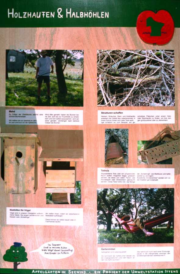Die Handlungsorientierung der vierten Tafel ist sofort erkennbar. Hier werden konkrete Ratschläge gegeben, wie wir sowohl der Ökologie der Apfelgärten, als auch der eigenen Lebensqualität auf die Sprünge helfen können. Das kann natürlich nur dann Sinn machen, wenn auch die Probleme, die zur Notwendigkeit solcher Maßnahmen führen, erkannt und verinnerlicht wurden. Wichtig war uns an dieser Stelle, nicht den mahnenden Zeigefinger zu erheben, sondern alltagstaugliche Hilfestellungen zu leisten.