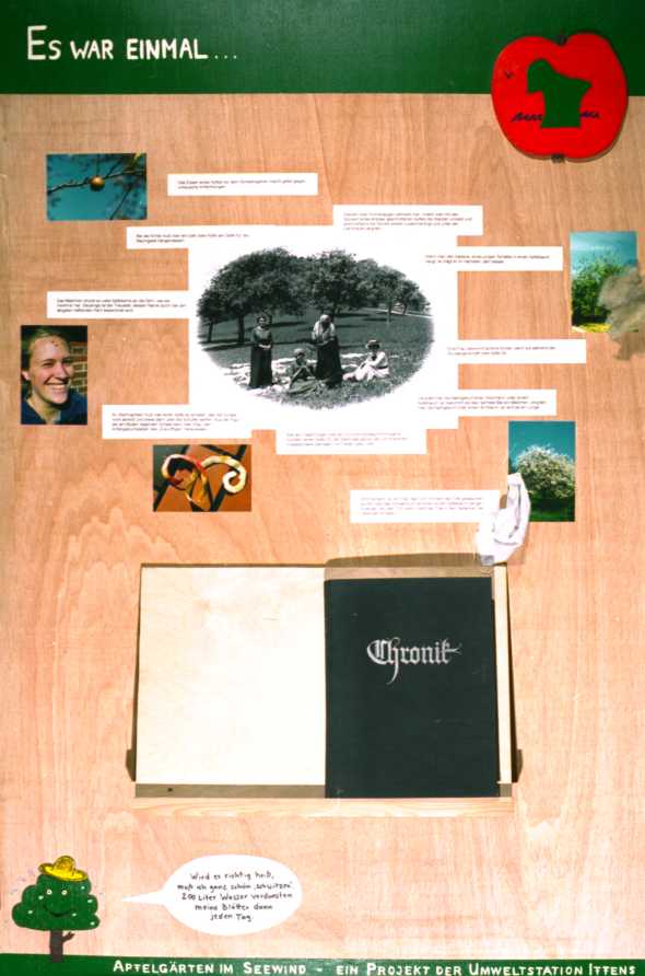 Darunter befindet sich ein Pult. Auf diesem Pult liegt ein großes schwarzes Buch mit dem Titel : “Chronik”. Dieses Buch lädt zum Blättern ein. Je nachdem, wie viel Interesse der Betrachter hat, kann er hier die Geschichte der Apfelkultur in Europa von der Jungsteinzeit bis heute verfolgen. Die Seiten sind jeweils nur mit sehr wenig Text in einer altertümlich anmutenden, geschwungenen, recht großen Schrift gefüllt, so daß das Lesen nicht als anstrengend empfunden wird. Der Text ist so aufgebaut, daß unser Küstenapfelbaum die Geschichte seiner Ahnen erzählt. Er taucht in unterschiedlicher “Verkleidung" in den unterschiedlichen Textpassagen auf: in römischer Rüstung, mit “Sonnenkönig”- Perücke oder Seemannsmütze.