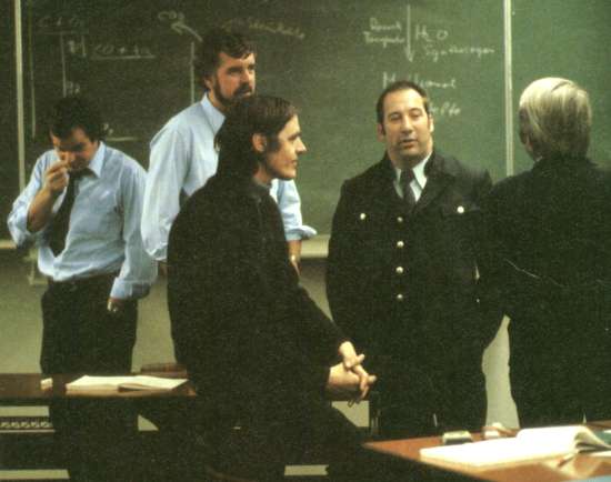 Jeden Mittwoch um acht Uhr hängt in einer Reihe säuberlich ausgerichteter blauer Feuerwehruniformen ein obskurer Ledermantel von der Art, wie man ihn an winterkalten Demonstrationstagen in Frankfurt oder Westberlin trägt. Im Unterrichtsraum setzt sich der Kontrast fort. Vorne wirft ein schlaksiger Lehrkörper Formeln und witzige Demonstrationsbildchen an die Tafel, in den Reihen hocken kreuzbrave Feuerwehrmannen, blauuniformiert, die erfahren wollen, was denn der atomare Kern all ihrer Anti-Feuerwaffen ist.